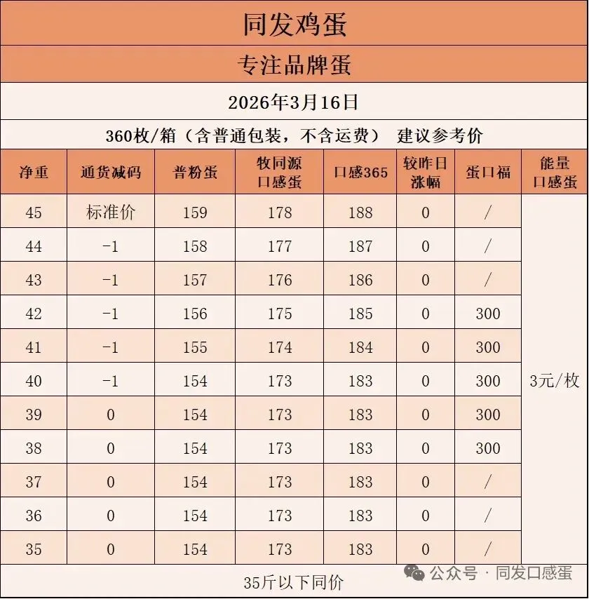 2026年3月16日贵港同发鸡蛋价格 养羊网 2026-03-16 2026年3月16日贵港同发鸡蛋价格以上价格为贵港同发鸡蛋平台公示的鸡蛋含包装成交结算价(上车价),仅供本平台渠道对接合作伙伴参考使用,不与其他任何报价做比较。 养羊网 2026-03-16 上一篇:2026年3月16日最新鸡蛋价格参考 下一篇:2026年3月16日全国部分地区鸡蛋价格 您可能还会对下面的文章感兴趣111: 相关文章 买皮沙发皮床请注意价格! 2026.01.15-明天猪价(猪价稳住了,还能破7冲8吗?) 【鸡蛋价格】2026.1.31—最新鸡蛋价格 济州岛旅行流水账 1??包含花费??