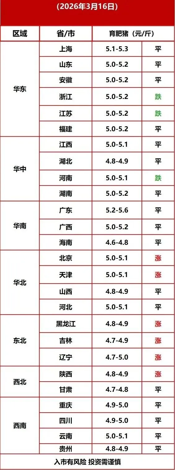 3月16日猪价 养羊网 2026-03-16 3月16日猪价每日猪价行情3月16日猪价点点赞推 荐 阅 读中东战火如何烧高我们的猪饲料?养猪人必看的成本预警!真金白银!温氏股份拟最高12亿回购,向市场释放最直接信号美国大豆想回中国餐桌?13%关税挡路,巴西笑了www.chinabreed.com中国养殖网编辑:郑高兴来源:中国养殖网、网络 养羊网 2026-03-16 上一篇:猪价大预测】3月18日~3月20日全国猪价大预测! 下一篇:今日猪价 | 2026.3.17明天猪价走势信息! 您可能还会对下面的文章感兴趣111: 相关文章 天猫超市1分鸡蛋今天都到了。 漂亮国:鸡蛋价格再飞会儿~ 2025年4月13日全国各地生猪价格信息 近期价格更新!!!