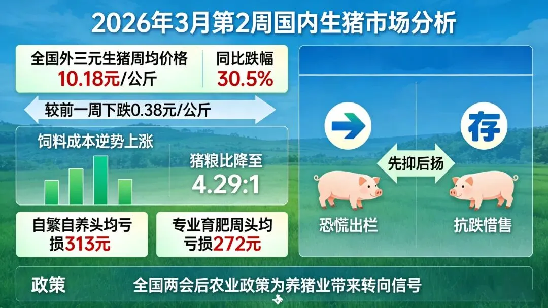 2026年3月第2周,国内生猪市场延续着开年以来的疲软态势。行情宝数据显示,全国外三元生猪周均价格为10.18 元/公斤,相比前一周下跌0.38 元/公斤(-3.6%),同比跌幅高达30.5%。在猪价持续探底的同时,饲料成本却逆势上涨。