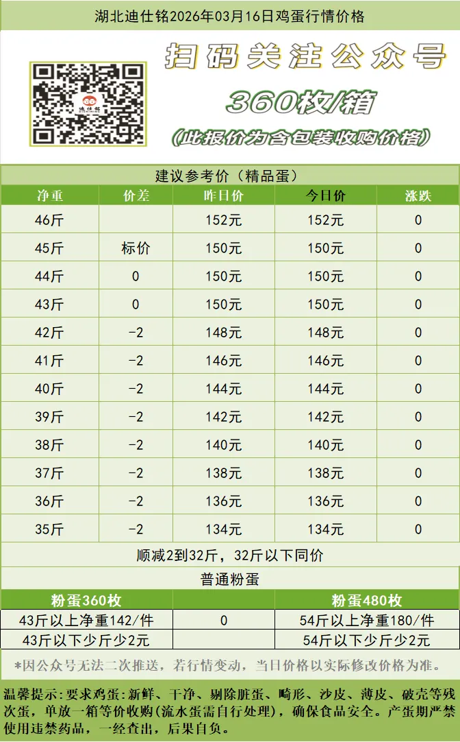 湖北迪仕铭2026年03月16日鸡蛋行情价格 养羊网 2026-03-16 湖北迪仕铭2026年03月16日鸡蛋行情价格 养羊网 2026-03-16 上一篇:今日鸡蛋行情速览|全国鸡蛋价格普涨,主产区涨价潮来袭 下一篇:2026.3.17,鸡蛋价格快讯 您可能还会对下面的文章感兴趣111: 相关文章 近期价格更新!!! 鸡蛋价格稳中有升,达这个区间就很不错,多少养殖户梦寐以求! 第39篇:什么是【猪周期】? 养羊近亲交配的,来生后果!