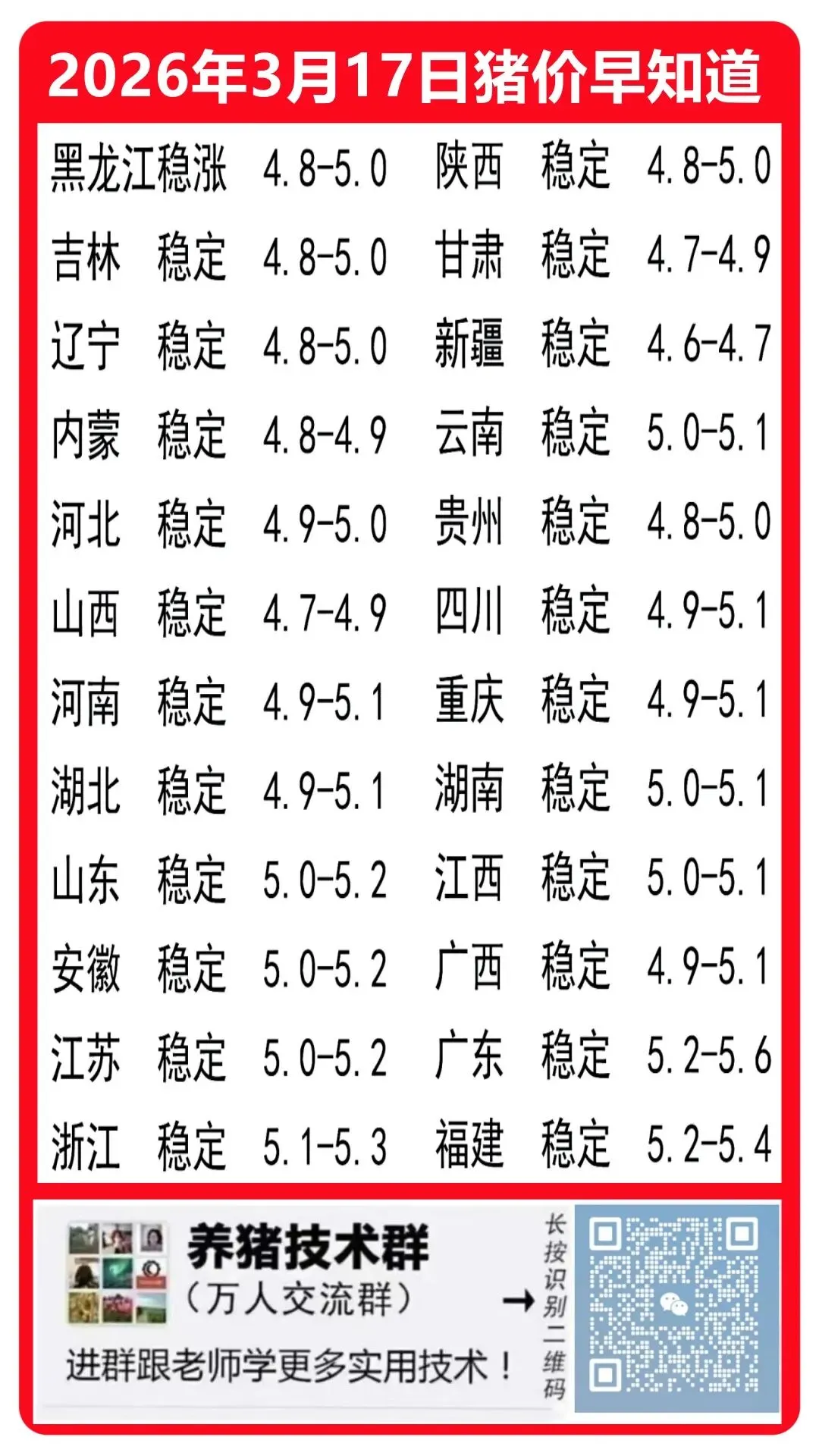猪价稳定为主!!2026年3月17日全国猪价依旧稳定!! 养羊网 2026-03-16 猪价稳定为主!!2026年3月17日全国猪价依旧稳定!! 养羊网 2026-03-16 上一篇:猪价7年新低,离历史最低只差3毛 下一篇:猪价跌破五元那天,老李抽了一整夜的烟 您可能还会对下面的文章感兴趣111: 相关文章 2026 . 3 . 14 鸡蛋价格 近期价格更新!!! 第39篇:什么是【猪周期】? 2026.03.16-明日猪价天天报