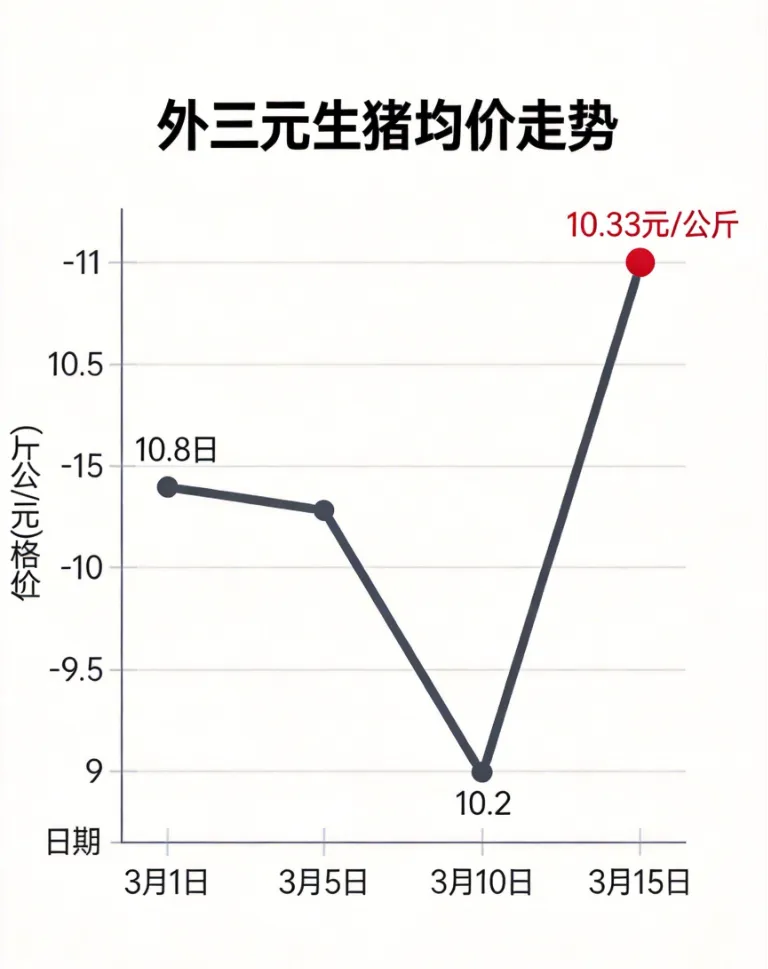 3月15日,全国外三元生猪均价10.33元/公斤,结束了连续下跌,出现反弹信号。虽然只比前一天涨了0.02元,但这根“阳线”让养殖户们长舒了一口气。