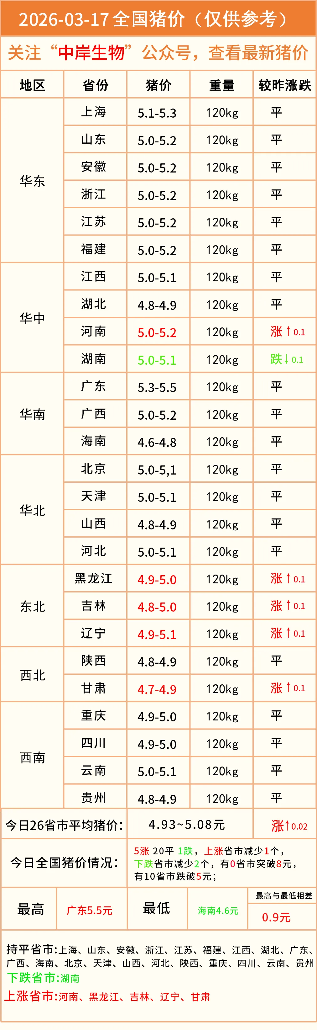 明日猪价|2026-03-17全国最新猪价(猪价已更新!) 养羊网 2026-03-16 明日猪价|2026-03-17全国最新猪价(猪价已更新!)营销中心丨0731-83806009技术服务丨0731-83806019 养羊网 2026-03-16 上一篇:全国猪价情况:10涨7平11跌 下一篇:预计猪价在5元附近震荡,但要警惕出现体重快速去化而闪崩 您可能还会对下面的文章感兴趣111: 相关文章 2025年4月13日全国各地生猪价格信息 赤峰游 DAY2 阿斯哈图石林?热阿线 香港中半山帝景园豪宅性价比高 2026年02月16日鸡蛋、鸭蛋价格总结