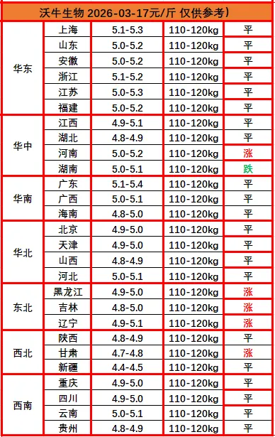? ?猪价播报沃小牛,助力养猪牛牛牛!各位养猪的老铁们,大家好!我是沃小牛,明天是2026年03月17日,最新猪价已经出来了:明日全国猪价整体以平稳运行为主,局部地区小幅涨跌。养猪人正处于双绞的“艰难”阶段:一边是纹丝不动的5元猪价,一边是持续走高的饲料原料。玉米、豆粕、鱼粉等饲料原料全线涨价,豆粕均价突破3300元/吨,鱼粉更是涨至17600元/吨,猪料累计上调50-100元/吨,饲料占养殖总成本65%-70%,单头育肥猪成本直接增加20-30元。猪价低位、成本高企的剪刀差持续扩大,行业陷入“卖猪亏、养得更亏”的恶性循环,养猪人不仅要扛住单头猪的亏损,还要承受现金流持续收紧的压力。理解养猪人的不易。