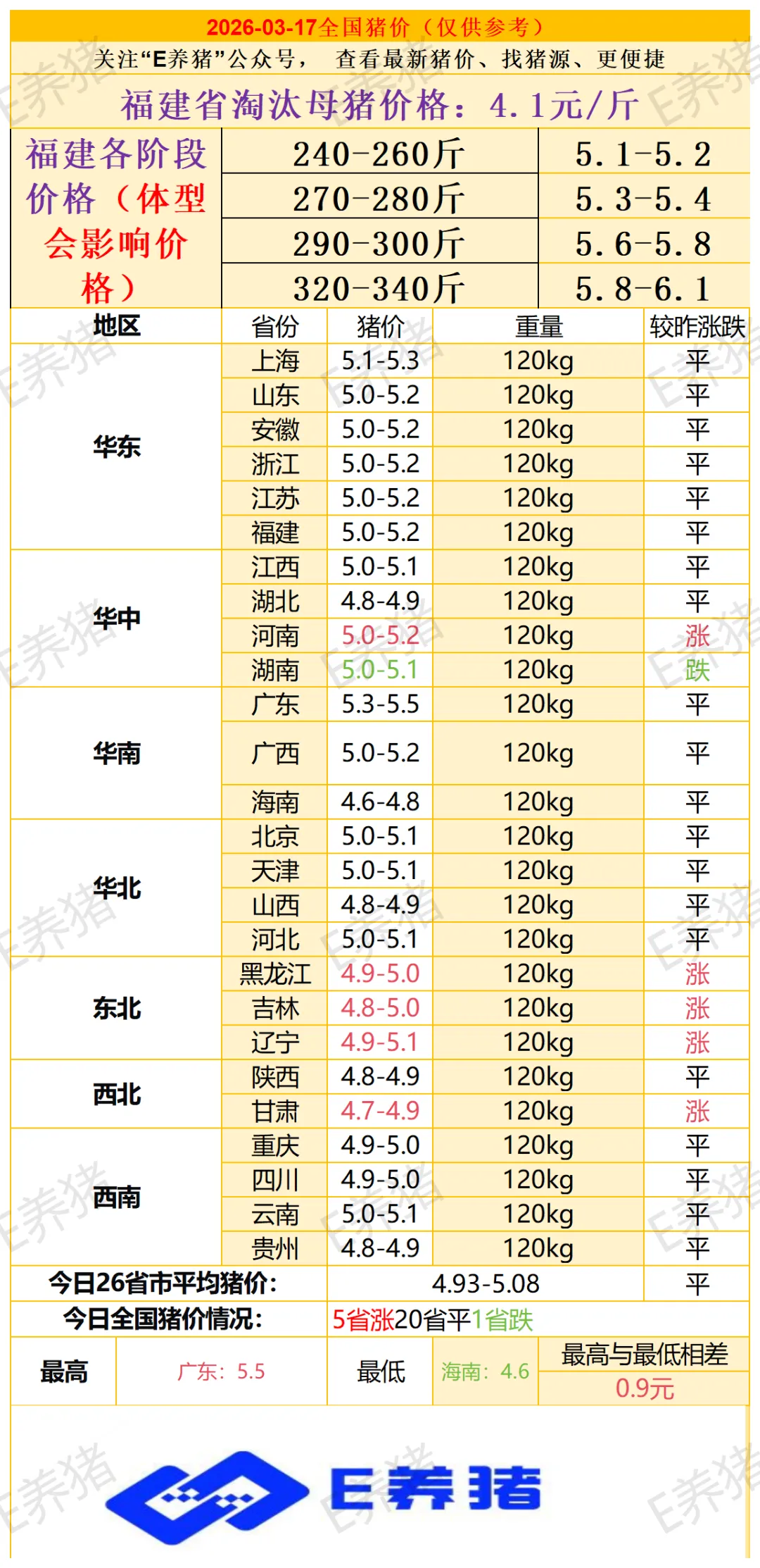 2026年3月17日猪价(稳中震荡)每日新增淘汰母猪价格、福建区域各阶段肥