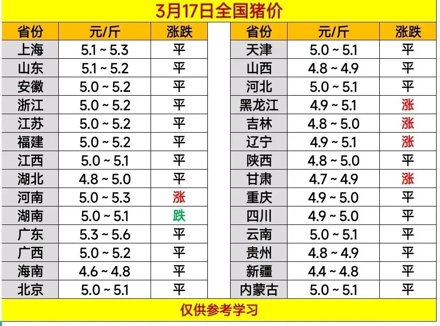 2026.3.17——明日猪价预测 养羊网 2026-03-17 2026.3.17——明日猪价预测 养羊网 2026-03-17 上一篇:明日猪价早知道,2026.3.17生猪价格 下一篇:【今日猪价】3月17日生猪报价!(附最新报价表) 您可能还会对下面的文章感兴趣111: 相关文章 2025年4月13日全国各地生猪价格信息 普通人适合哪些大健康赛道? 1月16日广西鸡蛋价格参考,广西继续上涨; 猪价跌至低位,5元能否稳住?(2026.3.11)全国猪价涨跌表