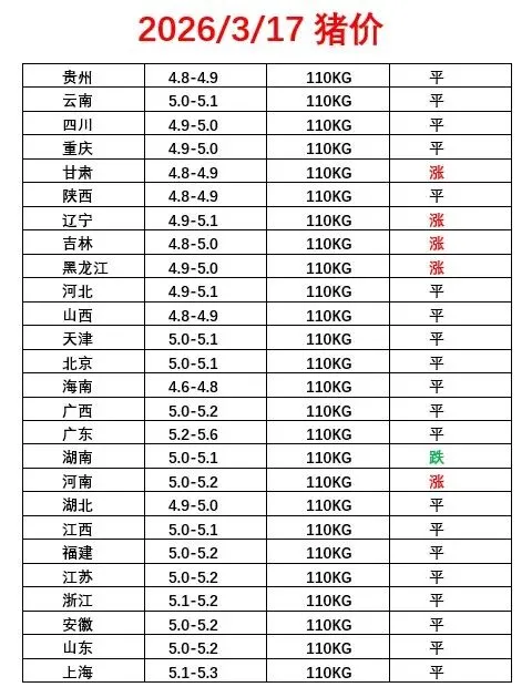 2026.3.17猪价出来了 养羊网 2026-03-17 2026.3.17猪价出来了? ? 关注下.每天准时报价 养羊网 2026-03-17 上一篇:3月17日云南昆明鸡蛋价格参考 下一篇:猪价跌穿5元,养一头亏两百!养猪人别慌,2026年下半年才有希望! 您可能还会对下面的文章感兴趣111: 相关文章 想创业了,有3W存款,可以开什么店? 【柯恩·今日猪价】2月14日生猪价格 如果酒店有风景,就得远方的家 【1月31日猪价】“惨绿”!多地行情断崖式走跌