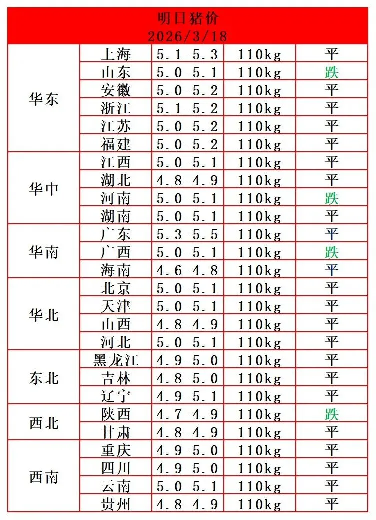 【猪价早报】2026. 3 . 18 全国猪价! 养羊网 2026-03-17 【猪价早报】2026. 3 . 18 全国猪价! 养羊网 2026-03-17 上一篇:猪价大预测】3月19日~3月21日全国猪价大预测! 下一篇:2026.3.18 --猪价 您可能还会对下面的文章感兴趣111: 相关文章 猪周期渐行渐近 【明天猪价】 2026. 01. 28 全国猪价! 猪价6字头不保!猪价今日猪价行情价格表 | 2026.2.24最新今日表行情走势分析 2月2日 | 正业生物猪价快报!