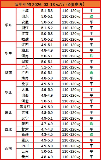 ? ?猪价播报沃小牛,助力养猪牛牛牛!各位养猪的老铁们,大家好!我是沃小牛,明天是2026年03月18日,最新猪价已经出来了:明天全国猪价依旧的一马平川,呈现“纹丝不动”的僵持态势。这一价格水平已击穿全行业现金成本线,自繁自养头均亏损扩大至300元左右,全行业亏损时间已超5个月。供给端出栏节奏虽有分化,二次育肥零星入场,集团猪企仍在减重增量出栏,叠加豆粕、玉米等饲料原料价格持续上涨,养殖成本压力有增无减。需求端则进入传统消费淡季,鲜品白条走货不畅,屠宰企业多被动入库,市场呈现供需双弱格局。一句话总结:猪价在底部窄幅震荡,既无上行动力,也无大跌空间,全行业继续在“黎明前的黑暗”中煎熬。