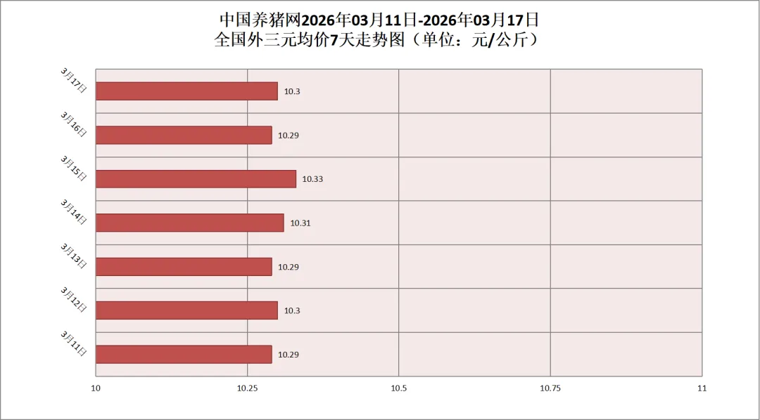 2026年03月17日(星期二),据中国养猪网猪价系统监测,全国外三元均价为10.30元/公斤,猪价较昨日(10.29元/公斤)上涨0.01元/公斤,较上月(12.52元/公斤)下跌了2.22元/公斤。