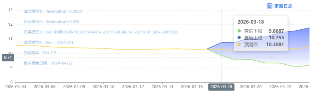 玄田算法是由项目课题组团队原创的非经典逻辑数值聚合理论和不确定性预测方法,构建了基于一致模算子的生猪价格预测模型。该模型采用的聚合函数及一致模相关理论与方法已获得多项国家自然科学基金和省级自然科学资金资助,并获得多项省级自然科学奖奖项。03月18日预测猪价为10.3081,置信区间在9.8687--10.755之间。03月19日预测猪价为10.1644;03月20日预测猪价为10.3444。