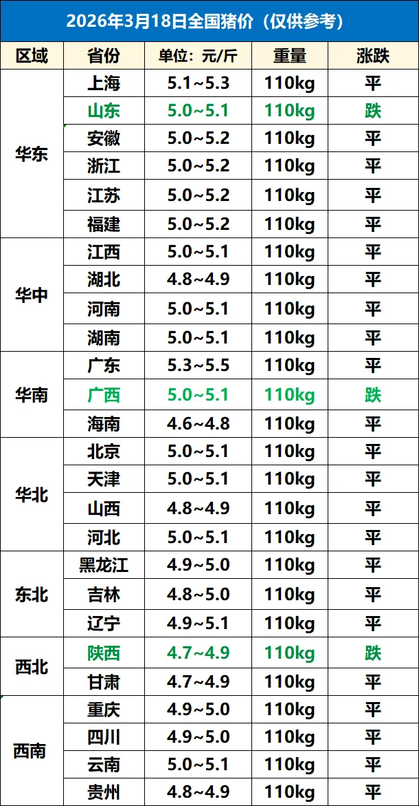 3月18日全国猪价大部平稳 养羊网 2026-03-18 3月18日全国猪价大部平稳 养羊网 2026-03-18 上一篇:今日超前猪价| (2026.3.19)仅供参考 下一篇:猪价底部回调 附2026年3月18日全国各地最新猪价行情 您可能还会对下面的文章感兴趣111: 相关文章 【明日猪价】-2026年2月15日 羊肉 自家养殖羊 2025年4月13日全国各地生猪价格信息 笨鸡蛋到底贵不贵