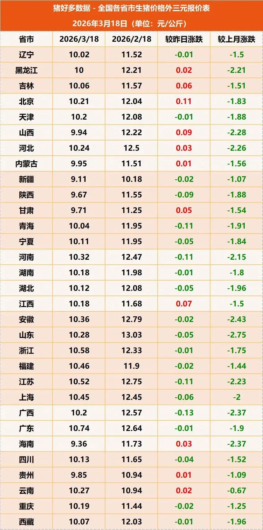 据猪好多数据监测显示,2026年3月18日全国外三元生猪均价为10.09元/公斤,较昨日下跌0.02元/公斤。当前生猪市场延续深度磨底态势,与此同时仔猪行情也开始“告急”,养殖户面临前所未有的挑战,养猪业去产能大幕全面开启!