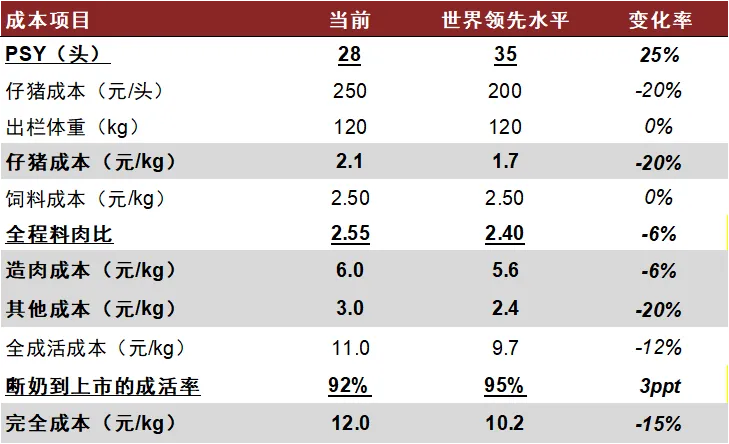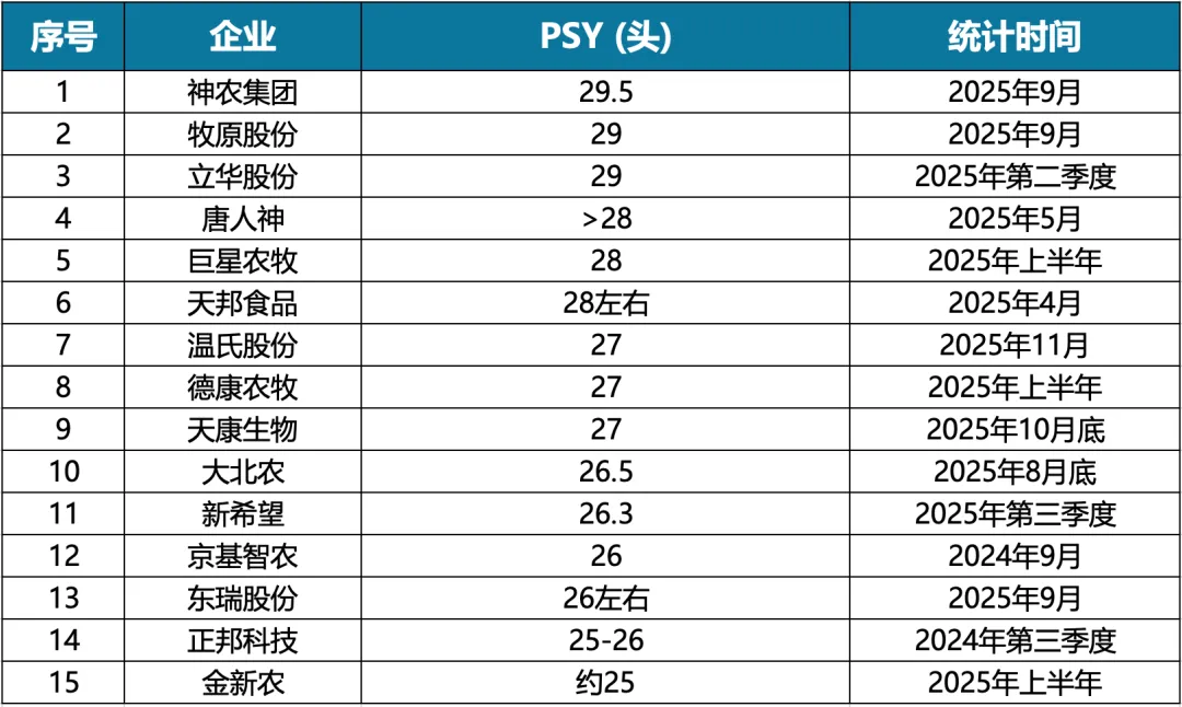 PSY(每头母猪年提供断奶仔猪数) | ≥29头 | 基于15家上市猪企PSY数据,前3名企业PSY均达到29头及以上 |