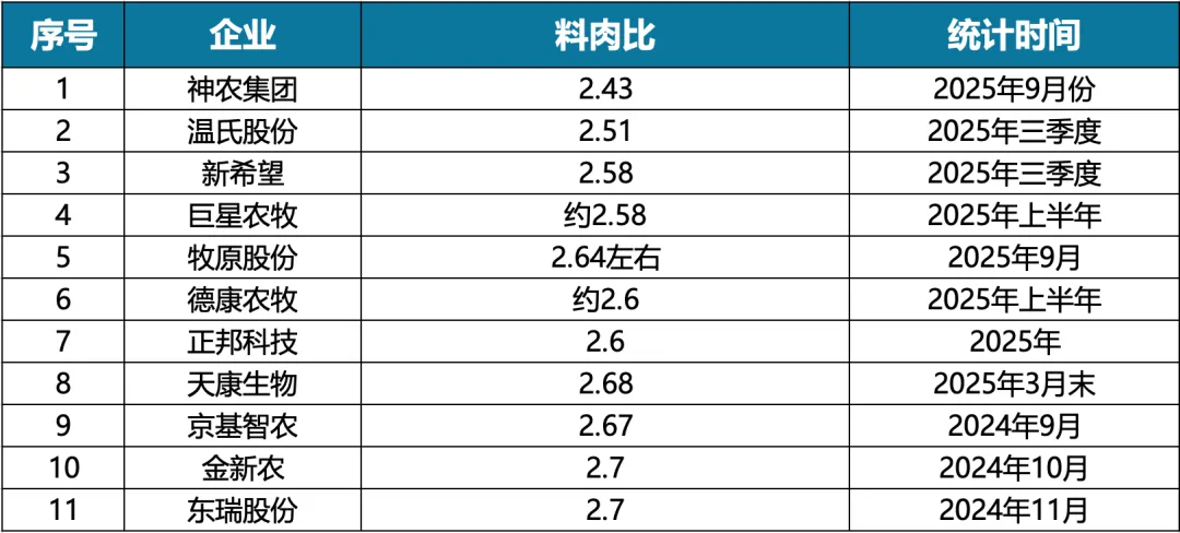 料肉比 | ≤2.43 | 基于11家公开料肉比数据的上市猪企,神农集团以2.43领先行业 |
