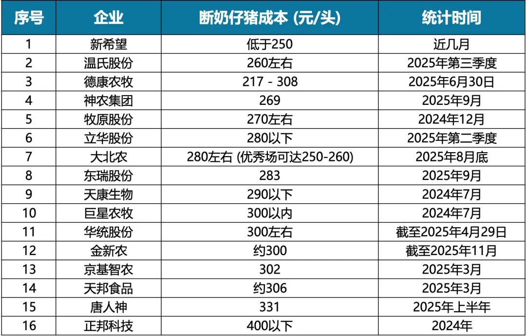 断奶仔猪成本 | ≤240元/头 | 基于13家上市猪企数据,牧原股份(230-240元)、新希望(240元)处于领先水平 |