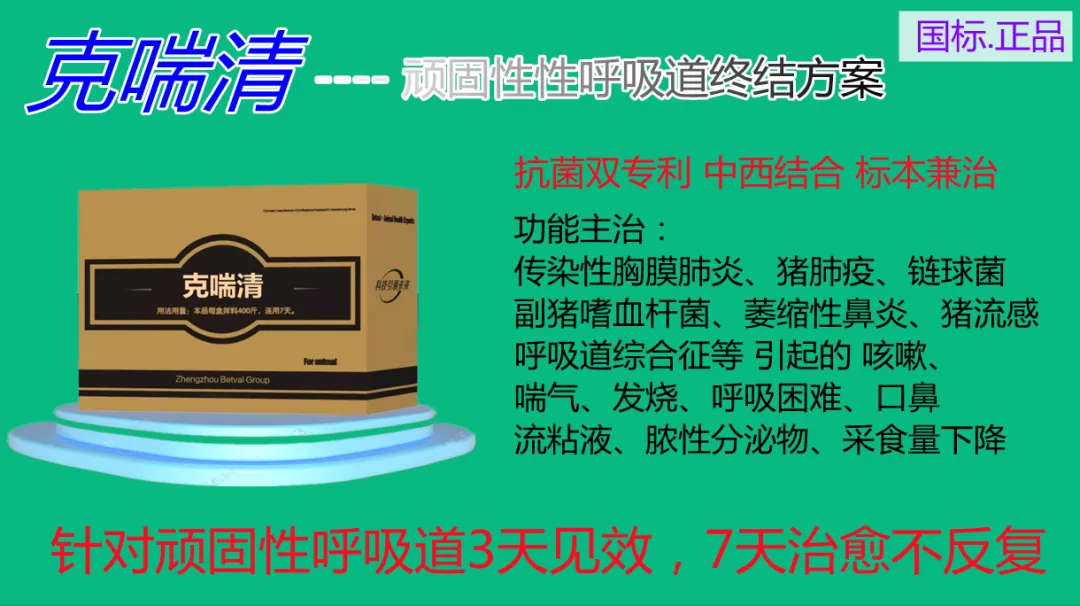 标本兼治?用于治疗和预防各种敏感菌如传染性胸膜肺炎,猪肺疫,链球菌,副猪嗜血杆菌,传染性萎缩性鼻炎,猪流感,呼吸道综合征等引起的咳嗽,喘气,发烧,呼吸困难,口鼻流沫或脓性分泌物,四肢末梢发绀等。