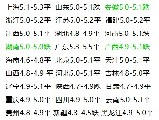 安徽,从5.0-5.2(平)跌到了5.0-5.1(跌);