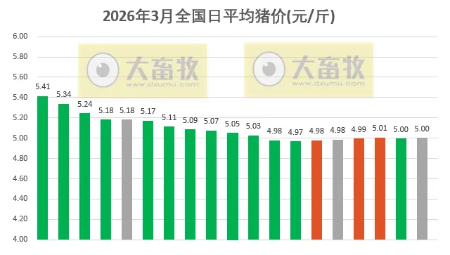 大畜牧小编根据我国27省的猪价数据,计算出2026年3月19日全国平均猪价为每斤5.00元,与昨天一样;