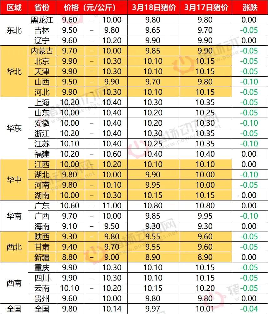 据统计,3月18日,屠宰企业散户主流收购120公斤-130公斤标准体重生猪平均价格为9.97元/公斤,较昨日价格保持下跌0.04元/公斤。19个省份猪价下跌,9个省份猪价企稳。 目前全国最高价为广东,价格为10.80元/公斤,较昨日价格保持不变;全国最低价为新疆,价格为8.90元/公斤,较昨日价格保持不变。