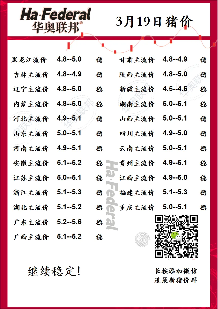 3月19最新猪价 稳定为主 养羊网 2026-03-18 3月19最新猪价 稳定为主进最新报价群 加微信 v联系电话:137 ?0084 ?5054 养羊网 2026-03-18 上一篇:2026猪价警报拉响!仔猪涨幅腰斩,散户养猪别再赌行情! 下一篇:2026.3.19 明日猪价! 您可能还会对下面的文章感兴趣111: 相关文章 这拼xx买的叶黄素可生食鲜鸡蛋到了 2025年4月13日全国各地生猪价格信息 吃"自由的鸡蛋"是要付出代价的 猪事帮|| 2月25日猪价早知道(或以跌为主!)