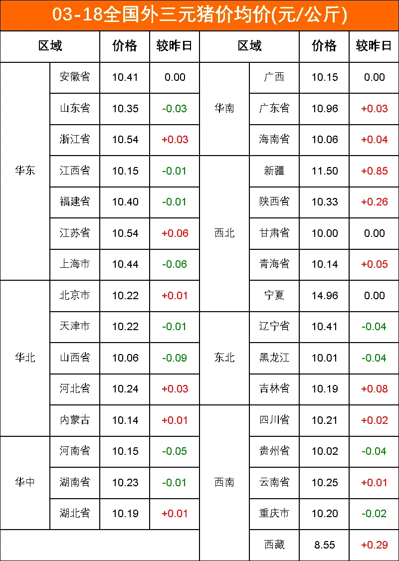 明日猪价:2026-03-19(元/斤)贵州4.8-4.9平新疆4.3-4.5平黑龙江4.9-5.0平