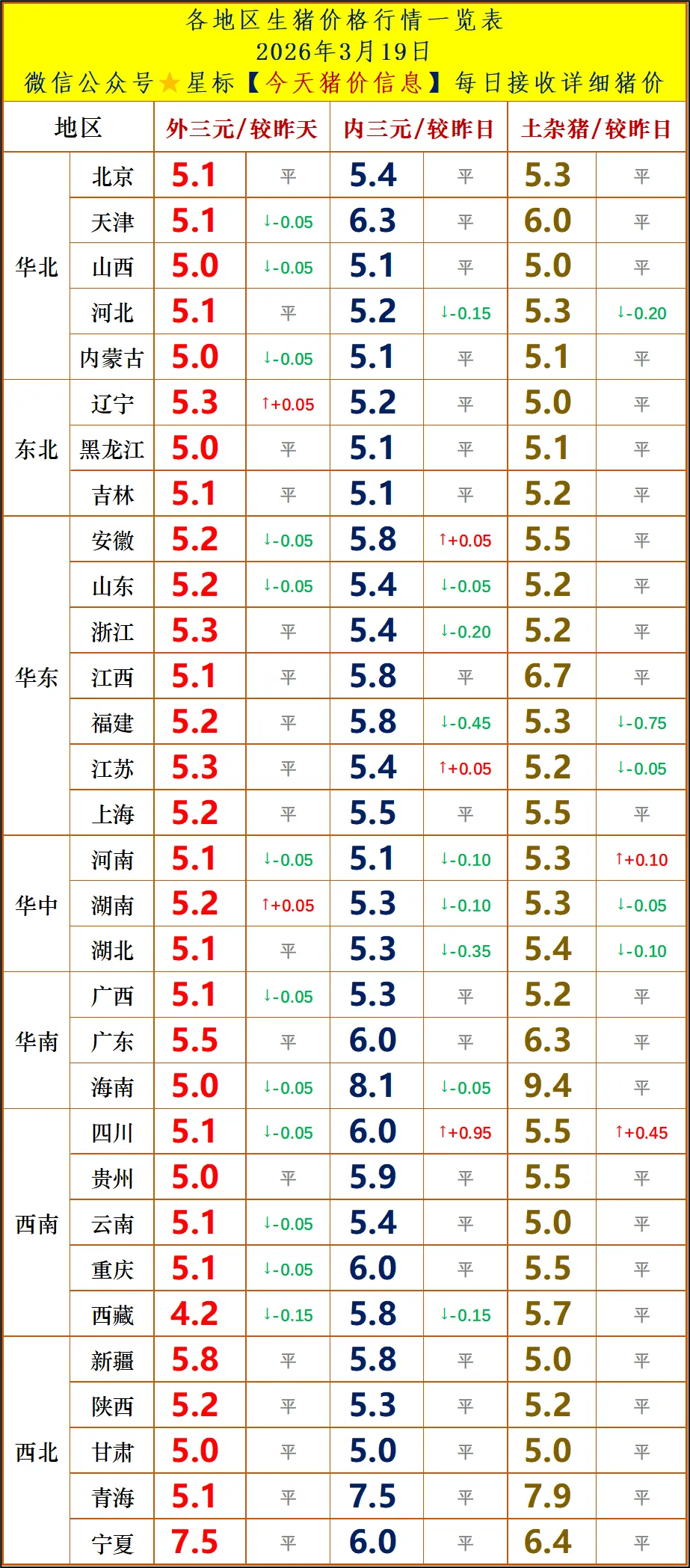 今日猪价 | 2026.3.20明天猪价行情分析!2026年03月19日猪价行情:全国综合均价5.00元/斤 外三元:5.13元/斤,较昨日下跌0.02元 内三元:5.25元/斤,较昨日下跌0.02元 土杂猪:5.21元/斤,较昨日下跌0.01元