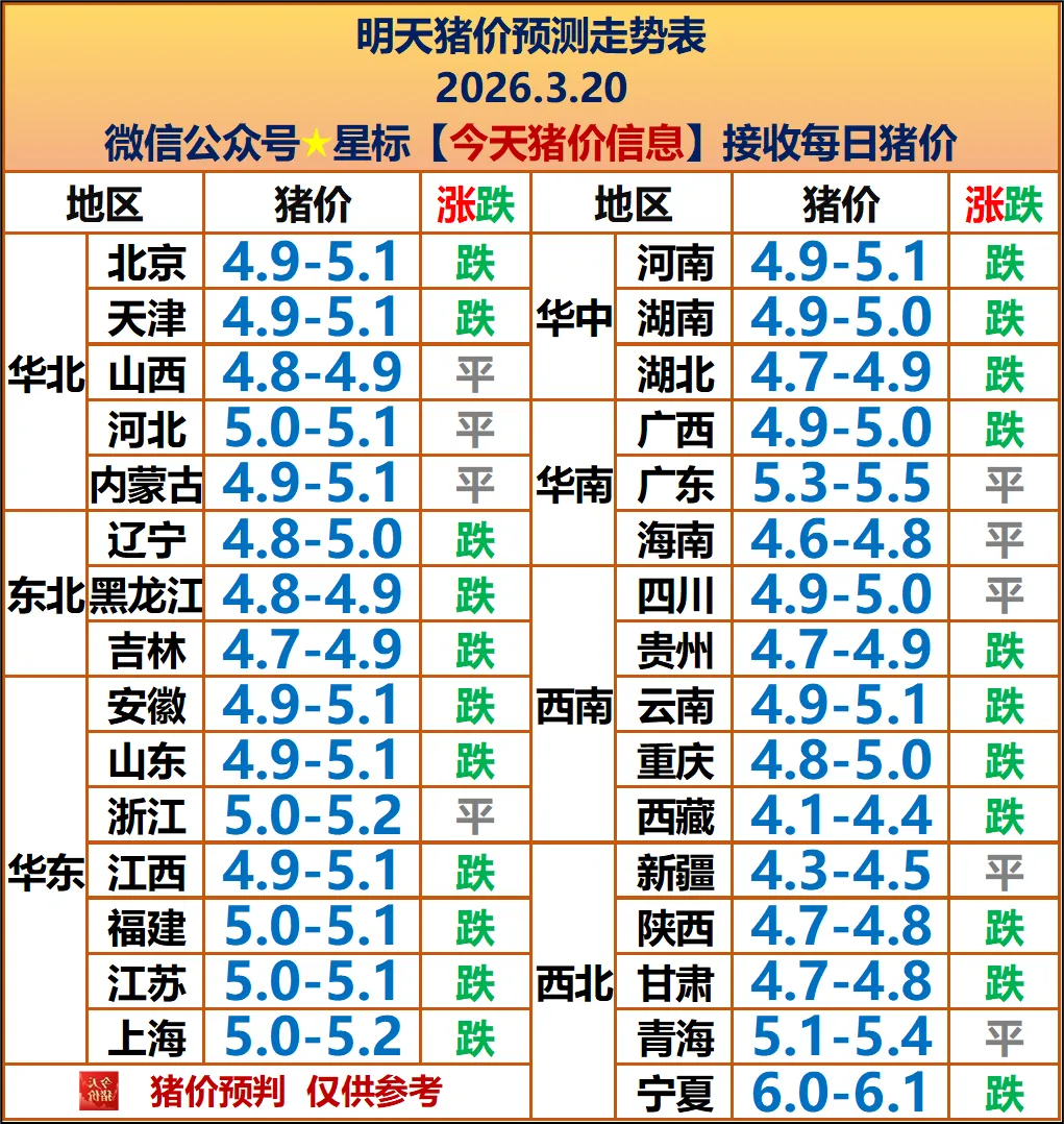 明天3月20日全国猪价以弱稳震荡、局部微跌为主,全国均价约5.0元/斤。河南、华中地区主流5.0-5.1元/斤,平稳运行。短期难有明显反弹,继续低位僵持,重点关注收储预期与清明前消费动向。