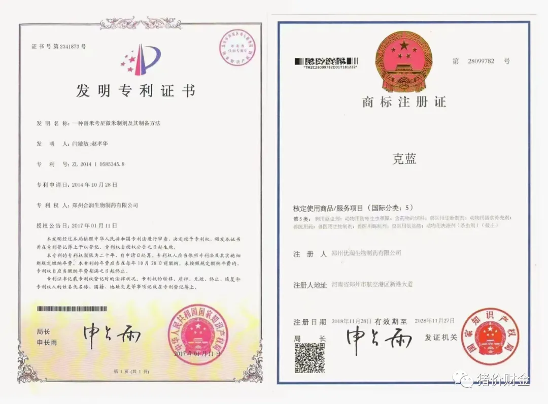 (1)研究历程:克蓝是畅销产品从08年开始就已经使用,历经十多年年逐步完善,2016年初上报农业部门经过一年的论证研究证实,证明克蓝套餐,针对蓝耳,圆环,副猪,支原体,链球菌,具有很好的净化治疗效果,最后颁发克蓝套餐专利证书让更多养殖朋友信任产品,并且名字申请了商标证书,是具有唯一性,专属优润集团专用。下图是产品专利证书,商标注册证书