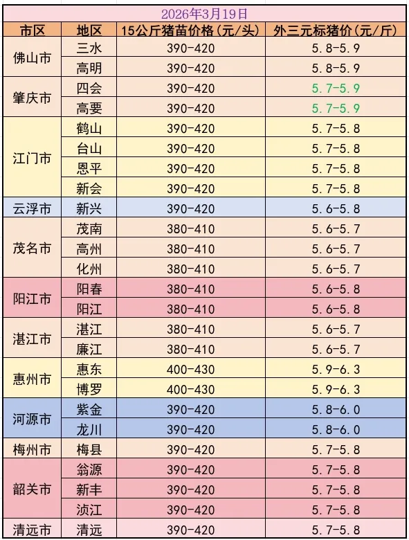 3月19日猪价速递 养羊网 2026-03-19 3月19日猪价速递广东猪苗全省报390~420元,毛猪报5.6~6.3元,除肇庆跌价外,其它地区价格稳定。(行情仅供参考) 养羊网 2026-03-19 上一篇:【明日猪价】2026.3.20 下一篇:【明天猪价】 2026. 03. 20 全国猪价! 您可能还会对下面的文章感兴趣111: 相关文章 近期价格更新!!! 2025年4月13日全国各地生猪价格信息 一夜降温!猪价又跌猛了!附: 26年3月2日 全国猪价 2025年4月13日全国各地生猪价格信息