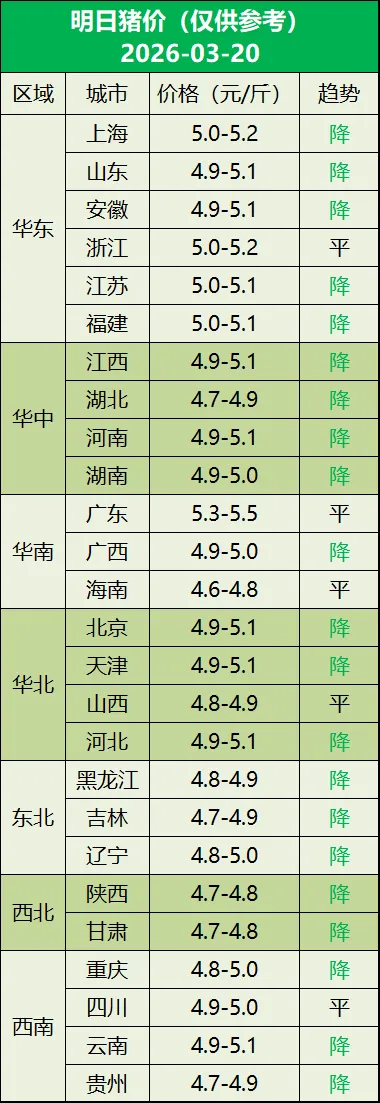 明日猪价(2026年03月20日) 养羊网 2026-03-19 明日猪价(2026年03月20日) 养羊网 2026-03-19 上一篇:2026.03.20-明天猪价 下一篇:2026.3.20明天猪价报价! 您可能还会对下面的文章感兴趣111: 相关文章 猪肉涨价了! 第39篇:什么是【猪周期】? 养金蝉赚钱:果树下养金蝉好赚钱 猪价“风云突变”,猪价、粮价迎新变化?3个好消息速看!