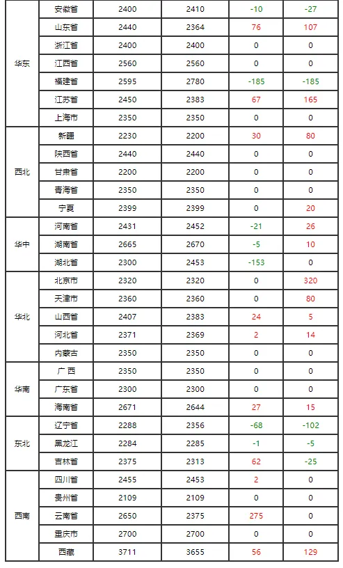 白羽肉鸡棚前价弱势下行,全国主流均价3.72元/斤,单日回落0.09元/斤,山东、河南、河北等主产区普遍下调0.10元/斤,东北产区跌幅偏小。终端冻品走货偏慢,屠宰企业压价收购,养殖端盈利微薄,部分散户陷入亏损,出栏节奏加快加剧供给压力。