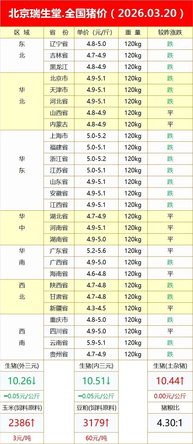 【每日猪价】北京瑞生堂猪价(2026-03-20)全国猪价