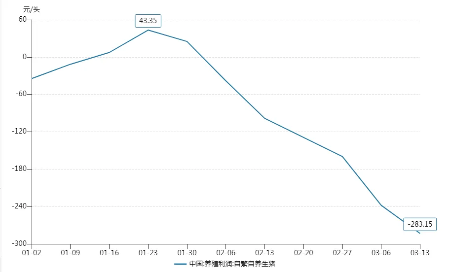 龙头企业尚且如此,中小养殖企业的日子更是举步维艰。博亚和讯数据显示,自2月6日当周生猪自繁自养模式重新转为亏损后,亏损额持续扩大,3月13日当周头均亏损已达283元,若按120公斤出栏体重估算,单头生猪价值仅1250元左右,养殖环节已陷入深度亏损。而散户因议价能力弱,单公斤饲料成本较规模企业高出1.7元,亏损程度更是远超行业平均水平,部分中小养殖户已开始被动退出市场。