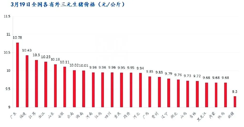 3月19日全国外三元生猪出栏均价为9.95元/公斤,较昨日下跌0.07元/公斤,最低价新疆9.3元/公斤,最高价广东10.78元/公斤。