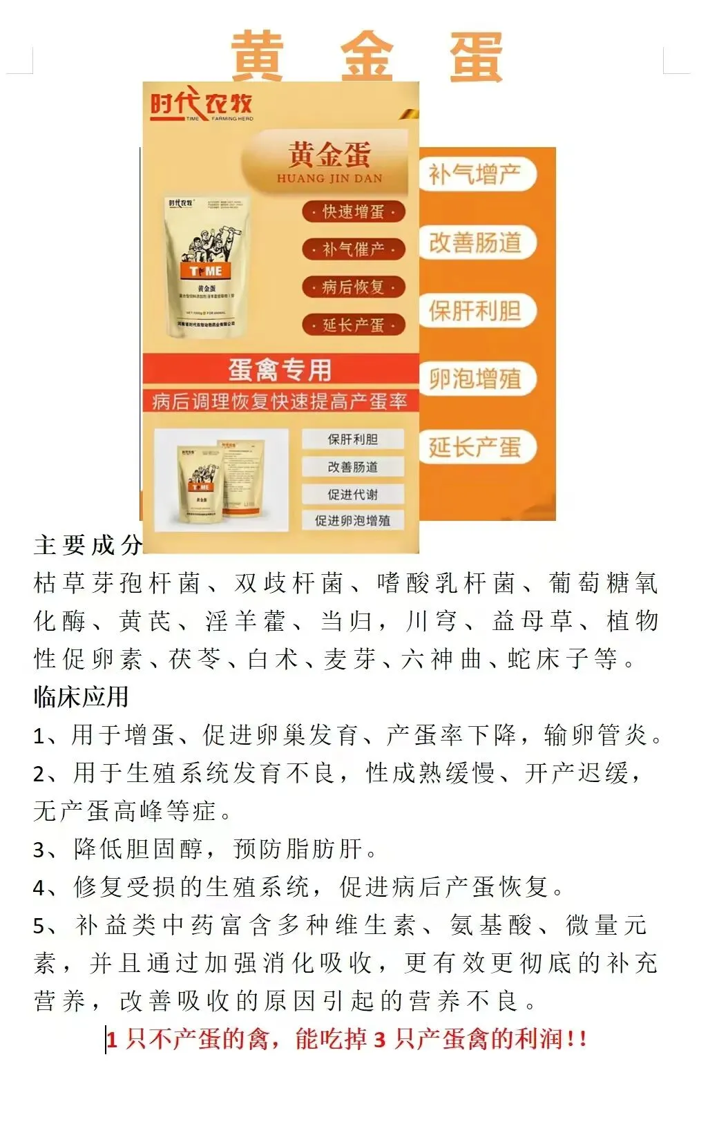 黄金蛋:本公司运用微生物发酵技术,将植物进行深层发酵,进行植物提取改造技术,从而达到降本增效的目的。同时结合传统中医理论,经实践成效论证,开发的用于提高产蛋率,延长产蛋高峰期的优质产微生态益生菌系列产品。二、黄金蛋蛋禽专用-产品特点 产蛋率上升,延长产蛋高峰,蛋黄增色,蛋壳厚度增加,提高蛋重,老鸡产蛋回升。可短时间内提高蛋禽产蛋率,增加蛋清粘稠度,蛋黄圆整,蛋清双层,蛋清细嫩;开胃消食,保肝护胆,提高机体免疫力;补充产蛋所需的多种元素,提高生殖系统健康状况,对产蛋下降、无精蛋、死胚蛋等有特效;能延长和维持产蛋高峰期,增加蛋重,改善蛋品质,减少无精蛋、死胚蛋;对各种环境应激引起的产蛋下降有恢复作用;防治产蛋疲劳综合症和减蛋综合症。三、黄金蛋原料组成成分:本产品适用于所有蛋禽。产品成分分析保证值:地衣芽孢杆菌主要原料组成及载体是地衣芽孢杆菌,载体为黄芪、益母草、山楂、补骨脂、淫羊藿、女贞子等十多味天然植物中草药粉。四、黄金蛋蛋禽专用-主要功能:①提高蛋禽采食量和营养物质利用率,改变体差无高峰鸡群;②增加产蛋率、改善蛋品质量(减少白壳蛋、沙壳蛋、薄壳蛋、异形蛋等) ;③蛋重增加、蛋黄增色,老鸡蛋壳如高峰、壳厚红韧润,短期内达到理想效果;④降低料蛋比和蛋禽死亡率、增强体质和免疫力;⑤减少蛋禽出现过料、肠炎、输卵管炎等现象的发生。五、黄金蛋用法用量:本品1000g拌料1000斤,连用5日。纠正产蛋下降时,本品1000g拌料800斤。最佳增蛋方案:黄金蛋3袋+活力肽500g+鱼肝油1kg拌料1吨,连用5天效果显著。包装规格: ?1000g/袋×25袋/件