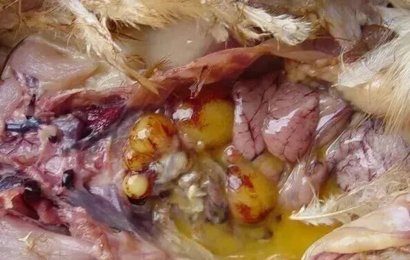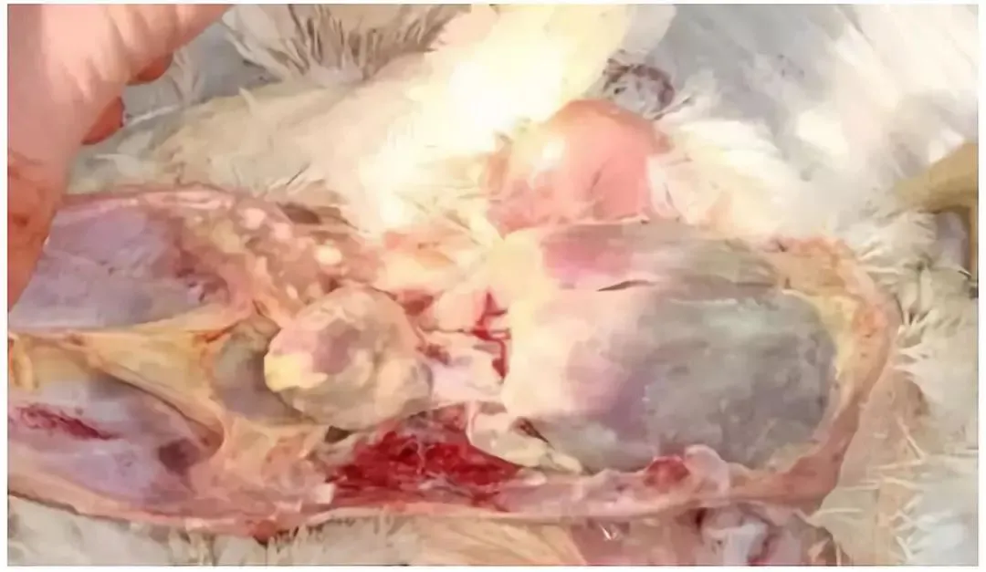 1. 大肠杆菌败血症6-10周龄的肉鸡多发,尤其在冬季发病率高,死淘率通常在5%-20%,严重的可达50%。雏鸡在夏季也较多发,病鸡精神不振,采食减少,衰弱和死亡。病鸡腹部膨满,排出黄绿色的稀便。特征性的病变是纤维素性心包炎,气囊混浊肥厚,有干酪样渗出物。肝包膜呈白色混浊,有纤维素性附着物,有时可见白色坏死斑。脾充血肿胀。2.?死胚、初生雏卵黄囊感染和脐带炎 种蛋内的大肠杆菌来自种鸡卵巢和输卵管及蛋壳被粪便的污染。侵入种蛋内的大肠杆菌在孵化过程中进行增殖,致使孵化率降低,胚胎在孵化后期死亡,死胚增多。孵出的雏鸡体弱,卵黄吸收不良,脐带炎,排出白色、黄绿色或泥土样的稀便。腹部膨满,出生后2-3天死亡,一般6日龄过后死亡率降低下来。即使不死的鸡,也是发育迟滞。死胚和死亡雏鸡的卵黄膜变薄,呈黄泥水样或混有干酪样颗粒状物、脐部肿胀发炎。4日龄以后感染常见心包炎,其中急性死亡的病雏几乎见不到病变。