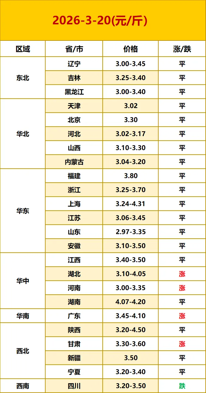 2026.3.20 今日鸡蛋价格 养羊网 2026-03-20 2026.3.20 今日鸡蛋价格蛋价日评:今日鸡蛋价格稳中有涨。市场供需僵持、走货一般;当前蛋价贴近养殖成本,下跌空间有限,需求处于淡季尾声,清明备货逐步启动,3月下旬蛋价仍有上涨空间,预计近期鸡蛋价格震荡偏强。以上报价仅供参考! 养羊网 2026-03-20 上一篇:2026年3月20日最新鸡蛋价格养禽必须知道大肠杆菌病的7种症状! 下一篇:猪价跌穿底价,养殖户集体压栏,玉米就要大涨?别被半吊子逻辑坑了 您可能还会对下面的文章感兴趣111: 相关文章 又踩雷了,真是羊皮的话我把它吃了 我宣布。。。我家以后就吃他家的鸡蛋啦!! 【明日猪价】3月2日:猪价巨震!全面大暴发!价格“失控”全面冲刺! 2026.1.21鸡蛋价格最新报价行情