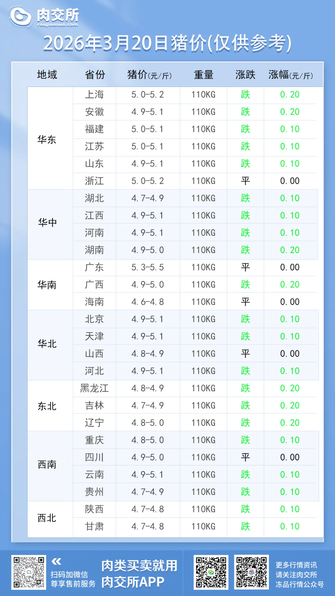 上海、安徽、湖南、广西、黑龙江、吉林、辽宁跌 0.2 元 / 斤,成为今日下跌主力; - 全面跟跌