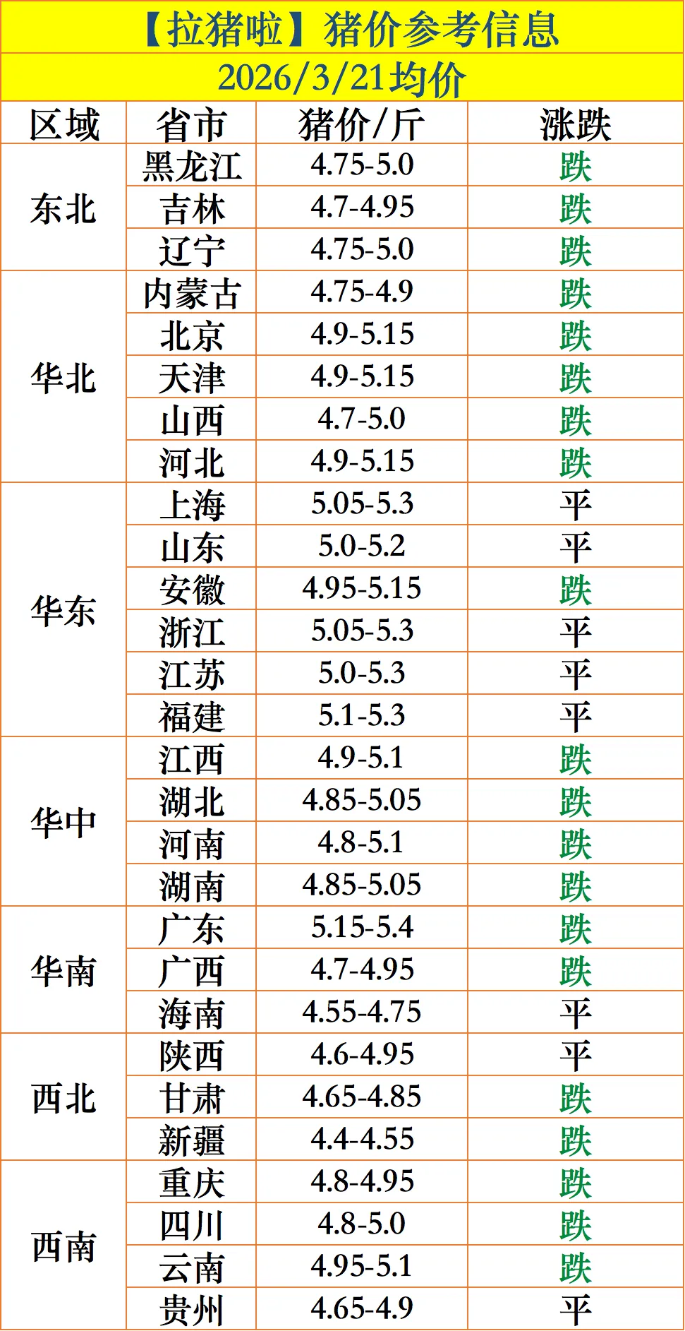 【拉猪啦】3.21-猪价行情与买卖猪信息!(已跌为主,跌幅缩小!)