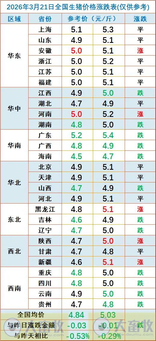 大畜牧小编根据我国27省的猪价数据,计算出2026年3月21日全国平均猪价为每斤4.94元,比昨天下跌0.02元,跌幅为0.41%,跌幅收窄,不仅是今年以来最低,更是至少是2019年以来新低;