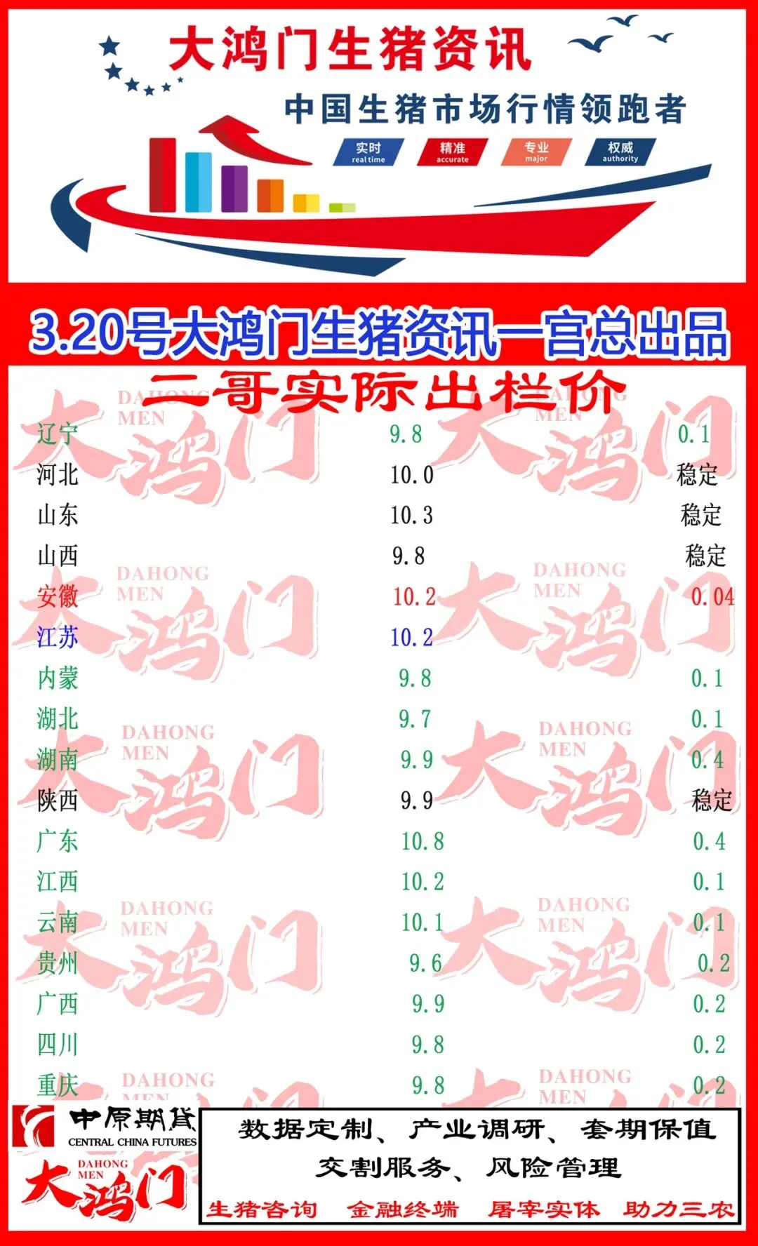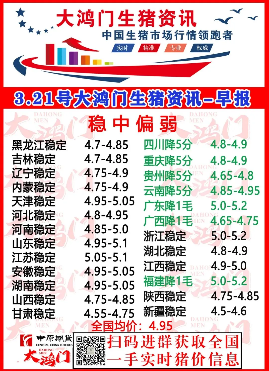 2026年3月20日西南养猪公司销售指导价格:四川4.95元/斤(降5分),重庆4.95元/斤(降5分)