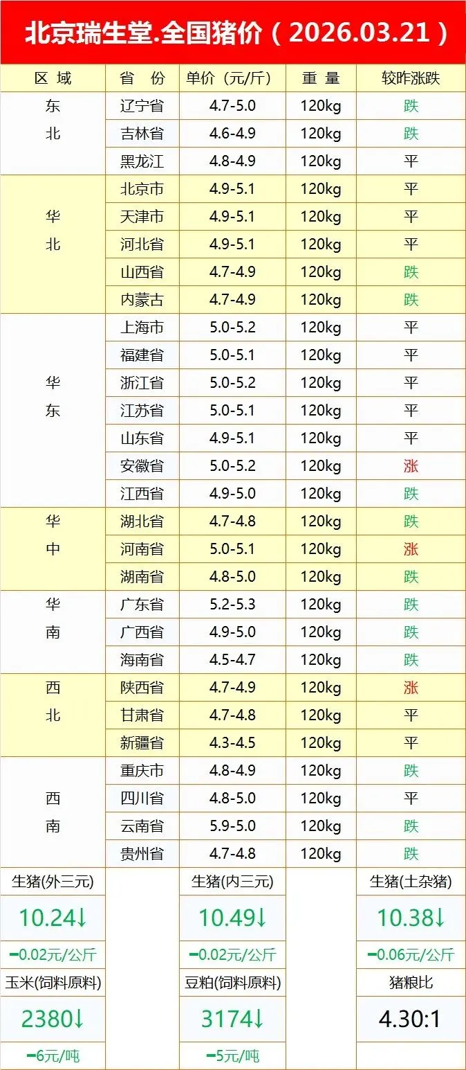 【每日猪价】北京瑞生堂猪价(2026-03-21)全国猪价