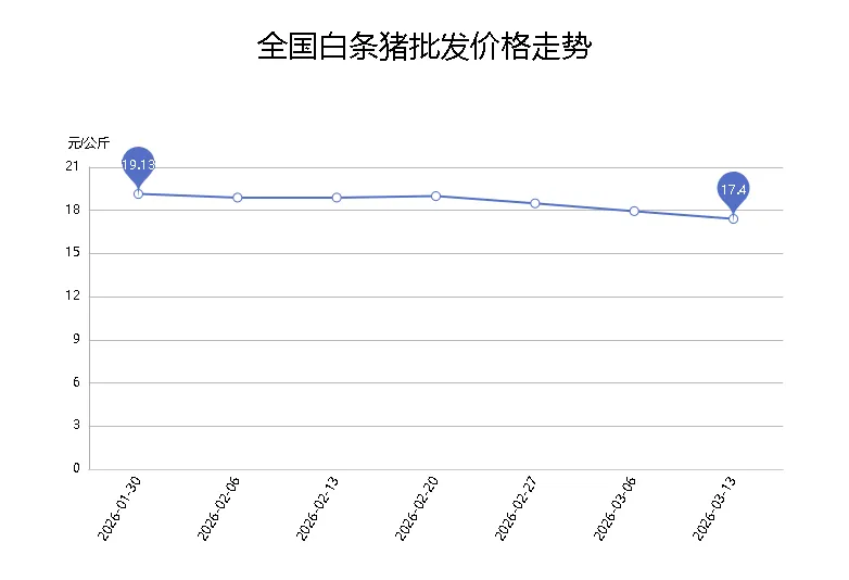 为此,猪场动力网查阅了商务部的相关数据,发现近两个月以来,生猪价格是一路猛跌,猪肉零售价格却只有小幅度下跌。 先看生猪价格,从1月下旬13.06元/公斤的高点一路跌至昨日的9.80元/公斤,不到两个月跌幅已达25%。 再看白条猪批发价格和猪肉零售价格,下跌的幅度可以说十分“温和”。 根据商务部统计的全国白条猪批发价格走势,1月30日,全国白条猪批发价格是19.13元/公斤;3月13日,批发价格是17.4元/公斤,下跌约1.7元/公斤,跌幅是9%,远不及生猪价格的降幅。