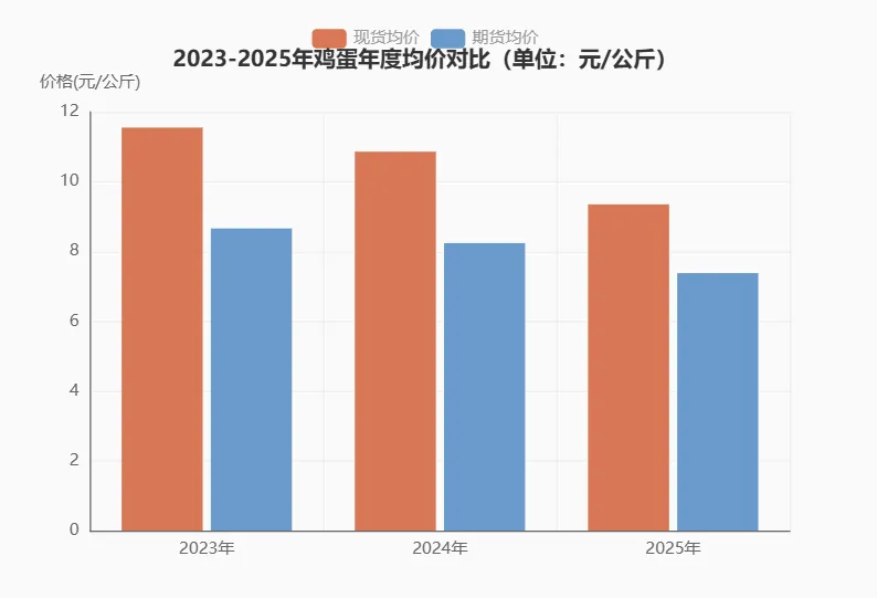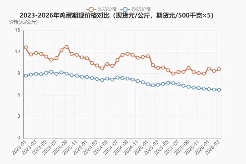 当前鸡蛋市场正处于一轮完整周期(2023-2026)的最艰难阶段。现货价格跌至近13年新低,期货价格创下2016年10月以来新低。与生猪市场相似,鸡蛋行业经历了"高盈利→扩产→过剩→深亏→去化→复苏"的完整周期,但期现价格的分化程度更为显著。
