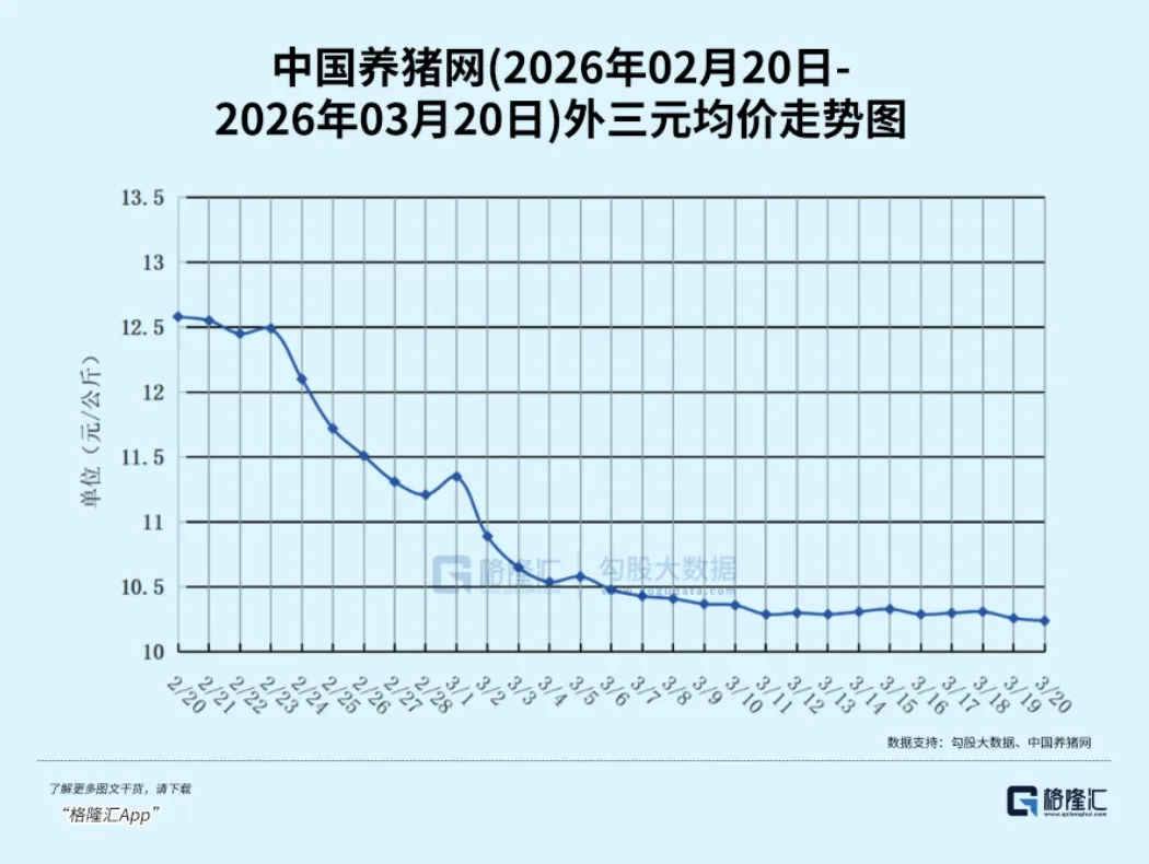 中国养猪网监测数据显示,截止3月20日,全国外三元生猪出栏均价已然跌至10.24元/公斤,即将跌破10元/公斤的心理支撑价位。
