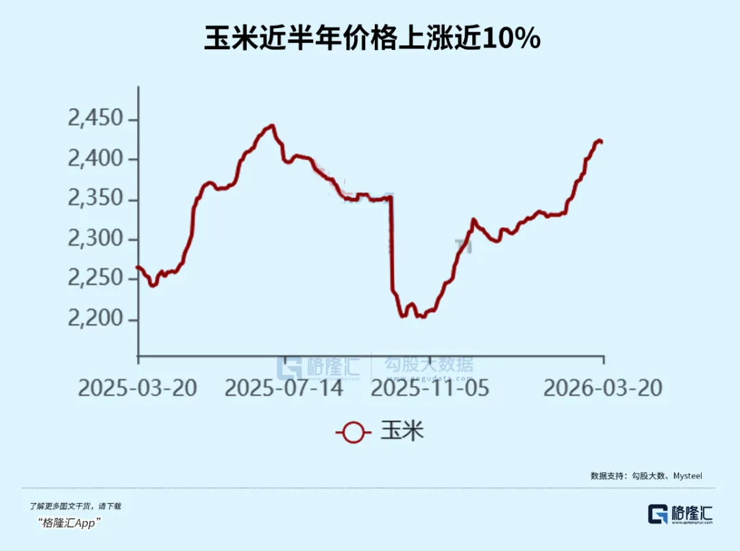 而近一段时间,农产品价格大幅上涨,其中,猪饲料的主原料——玉米近半年价格上涨近10%,豆粕年内价格也涨超10%。