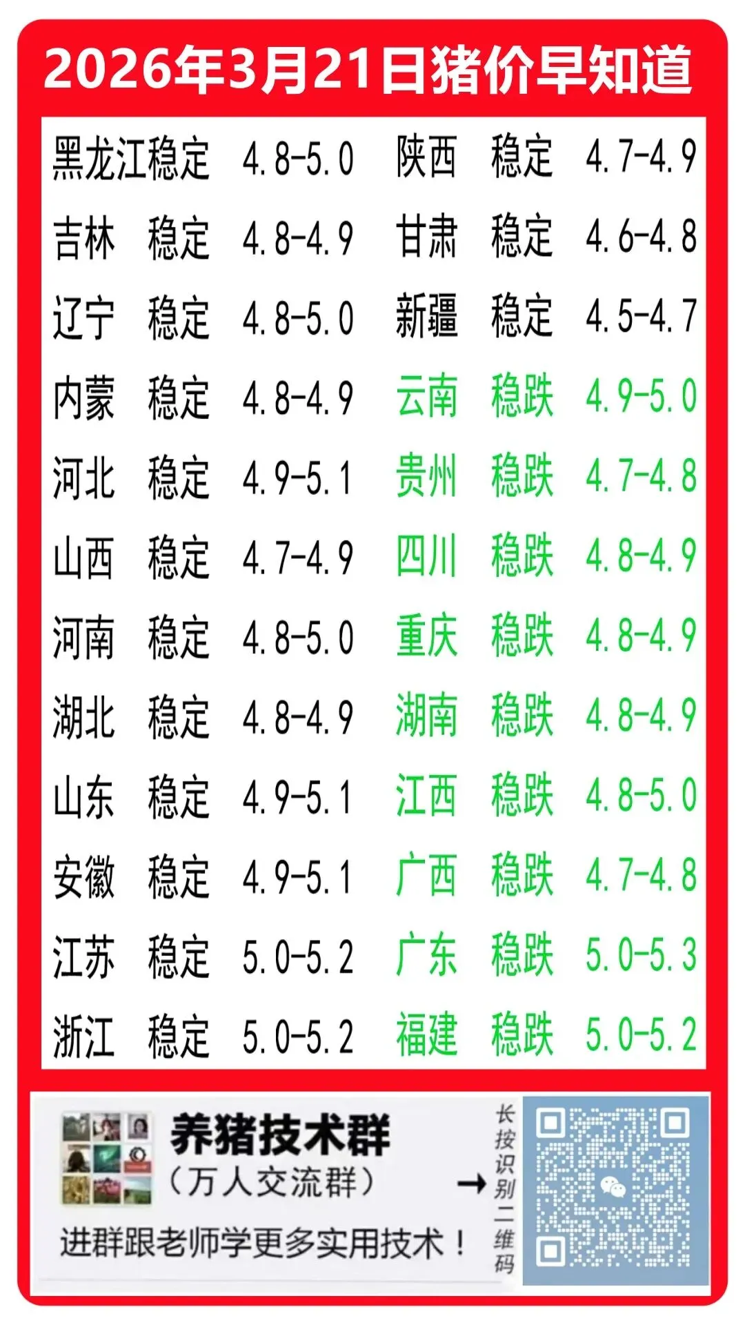北稳南跌!!2026年3月21日多省猪价继续下跌!! 养羊网 2026-03-20 北稳南跌!!2026年3月21日多省猪价继续下跌!! 养羊网 2026-03-20 上一篇:猪价暴跌!养猪龙头惨过白酒 下一篇:猪价跌破10元大关,深度亏损已成行业常态?『生猪行情2026年03月20日』 您可能还会对下面的文章感兴趣111: 相关文章 2026.03.07德邻生物鸡蛋价格早报(仅供参考) 天津人有自己的货币|天穆 近期价格更新!!! 2026年3月15日鸡蛋价格最新报价行情参考
