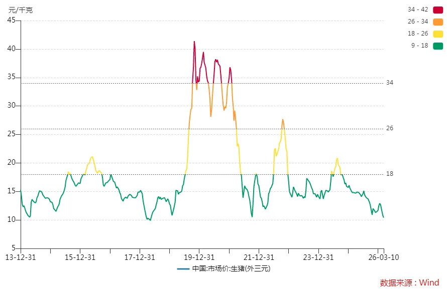 就拿最具成本优势的头部企业来说,牧原股份近期在投资者互动平台透露:“由于2月份存在春节假期,有效销售天数少、销售数量低,因此单位期间费用分摊增加。公司2026年1-2月的平均生猪养殖成本在12元/kg左右。”