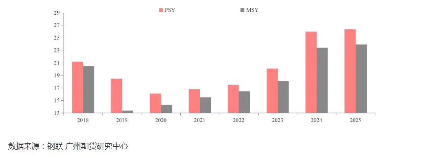 依据上海钢联、广州期货提供的数据,国内能繁母猪PSY(即每头母猪每年能提供的断奶仔猪数量)从2020年的16.1增长到2026年的26.34,增幅超过六成。
